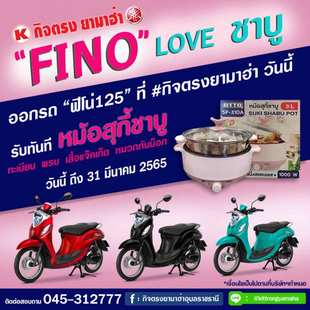 อาใจคอชาบูกับ…โปรโมชั่น ” FINO ” LOVE ชาบู ออกรถ ฟีโน่125 ที่ #กิจตรงยามาฮ่า วันนี้ รับทันที หม้อสุกี้ชาบู พร้อมกับ ทะเบียน พรบ. เสื้อแจ็คเก็ต หมวกกันน็อก (ระยะเวลาโปรโมชั่น วันนี้ ถึง ตั้งแต่วันนี้ – 31 มีนาคม 2565) *เงื่อนไขเป็นไปตามบริษัทฯกำหนด ขอสงวนสิทธิ์การเปลี่ยนแปลงโดยไม่ต้องแจ้งให้ทราบล่วงหน้า ติดต่อสอบถาม : 045-312777 เพจเฟสบุ๊ค คลิก https://www.facebook.com/KittrongYamahaUbonratchathani/ แอดไลน์ คลิก http://line.me/ti/p/%40zqy6494n ติดตาม ยูทูป คลิก : https://www.youtube.com/…/UC8hT4lWAFGhkmBOvExFX8vg/videos ติ๊กต็อก : tiktok.com/@kittrongyamahaubon ซื้อมอเตอร์ไซค์ซื้อที่ไหน ? ซื้อมอเตอร์ไซค์ ต้องซื้อที่กิจตรงยามาฮ่าฯ ________________________________________ For more information please contact : 045-312777 Page…